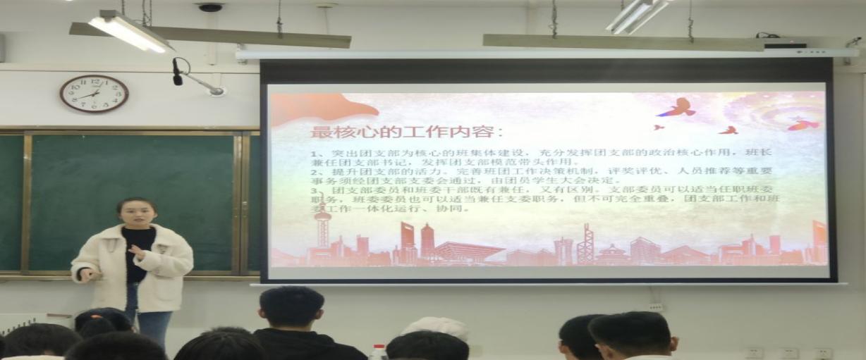 培训分为四部分进行。首先,进行了共青团史、团干部职责、团支部任务及学生入团条件和要求等内容的培训;其次,进行了 “三会两制一课”内容的培训;接下来,就具体班级事务与学生团干部职责进行了经验介绍和分享;最后,进行了公文写作相关内容的培训。